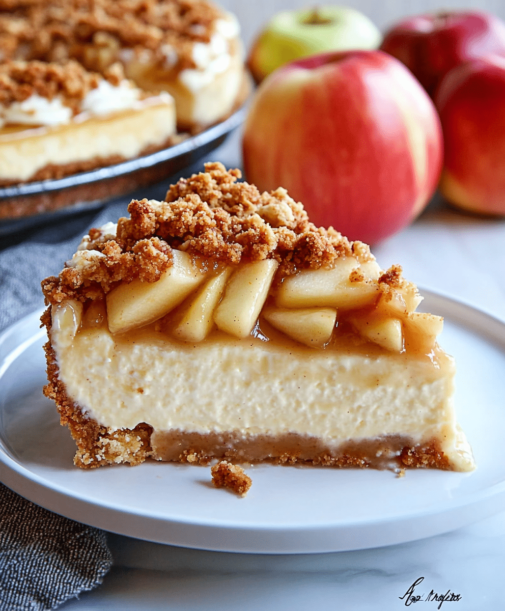 Apple Crisp Cheesecake is a layered dessert that beautifully marries the rich and creamy texture of cheesecake with the crumbly, cinnamon-spiced goodness of an apple crisp topping. The base is made with a buttery graham cracker crust, followed by a thick layer of cheesecake, and topped with cinnamon-sugar-coated apples and an oat-based crisp topping. The result is a dessert that has it all—smooth, crunchy, tart, sweet, and just a hint of warmth from the spices.