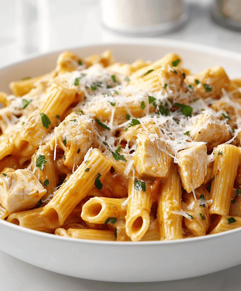 - Combine: Toss chicken and pasta in the creamy sauce, adjusting consistency with pasta water.