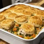 This Chicken Pot Pie Casserole recipe is a comforting dish filled with tender chicken, mixed vegetables, and a rich creamy sauce, all topped with a golden flaky crust. Perfect for a hearty dinner, this one-pan meal is a family favorite that combines the classic flavors of chicken pot pie in an easy-to-make casserole.