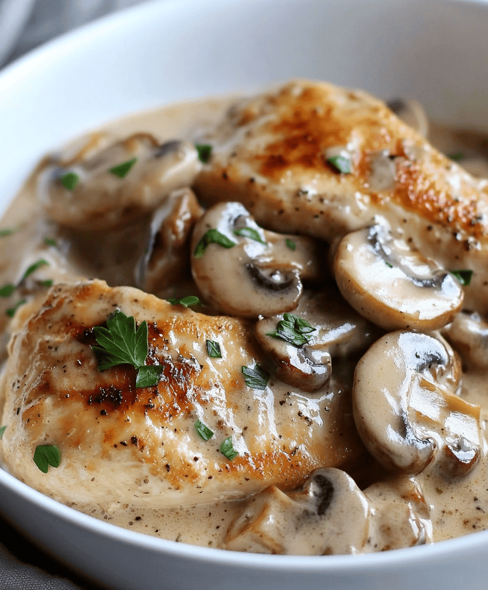 This Creamy Mushroom Chicken recipe features tender chicken breasts smothered in a savory mushroom sauce. Keywords: creamy mushroom chicken, easy chicken recipe, chicken dinner, one-pan recipe, mushroom sauce.