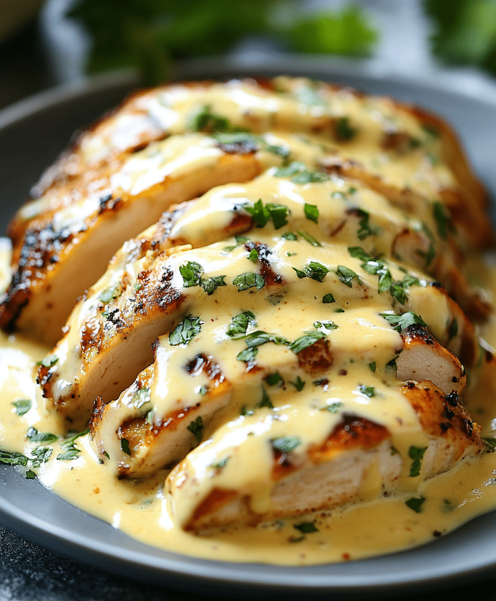 - Pour cheese sauce over the cooked chicken breasts.
