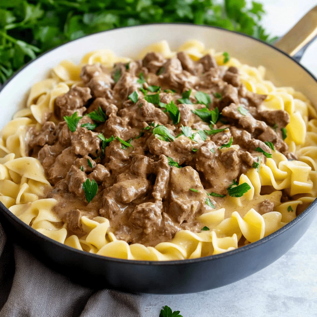 - Use a Large Serving Dish: Serve the Stroganoff in a large, shallow dish to show off the hearty beef and noodles. Garnish with parsley just before serving to add a pop of color.