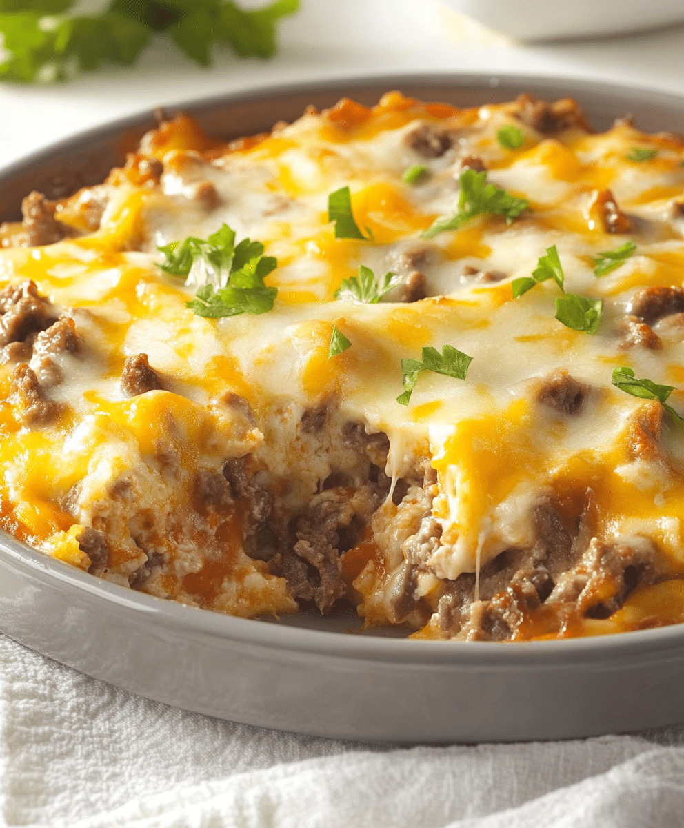 For a perfect presentation, slice the casserole into neat squares and use a spatula to serve. The melted cheese and tender steak should hold together nicely, offering a delicious cross-section of layers. Garnish with freshly chopped parsley for a pop of color.